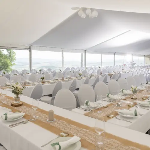 Hochwertige Eventausstattung wie elegante Tische, gepolsterte Stühle & stilvolle Beleuchtung sorgen für eine festliche Atmosphäre. Ob romantisch, modern oder klassisch – euer Hochzeitszelt wird genau so, wie ihr es euch wünscht.